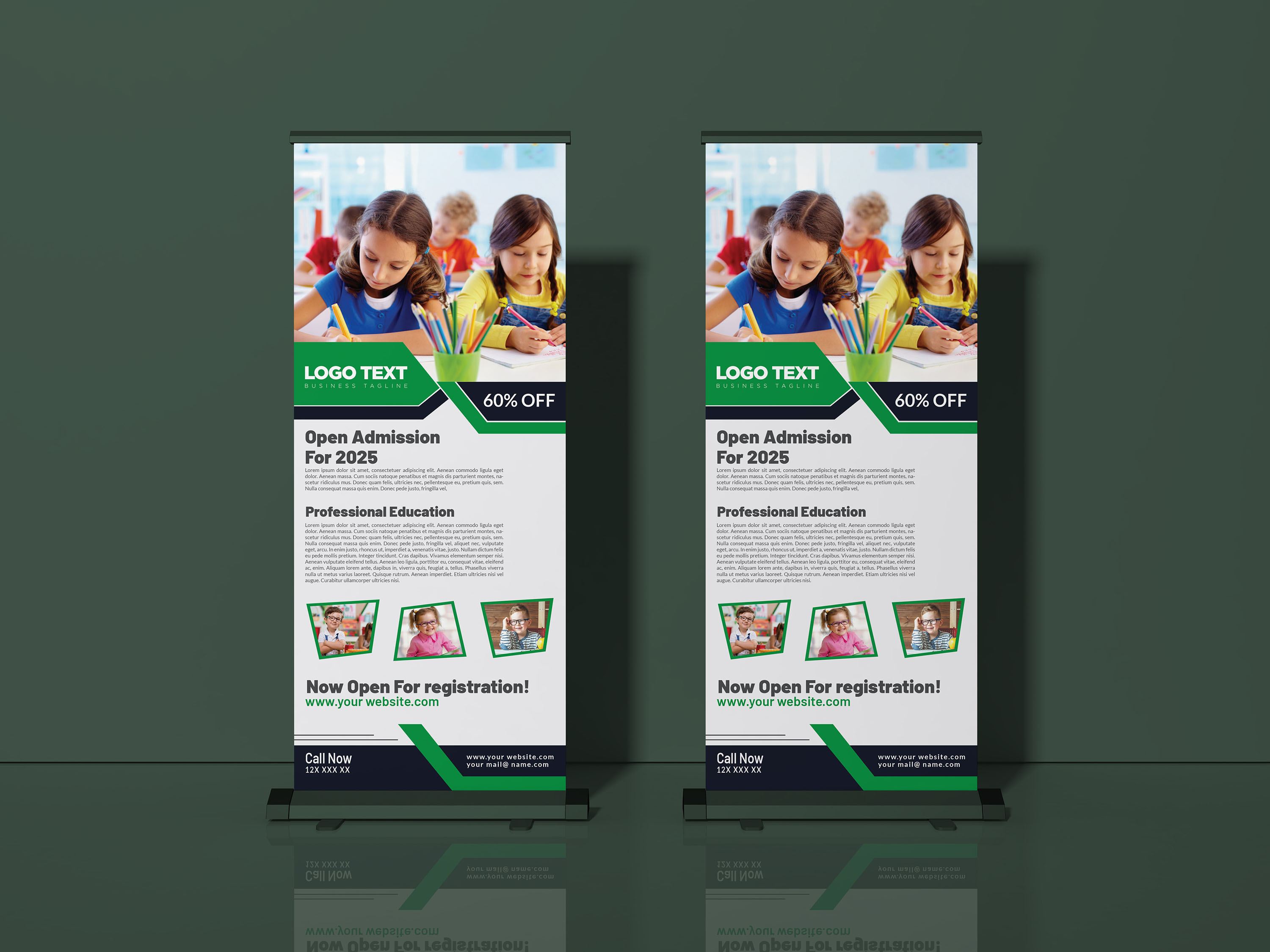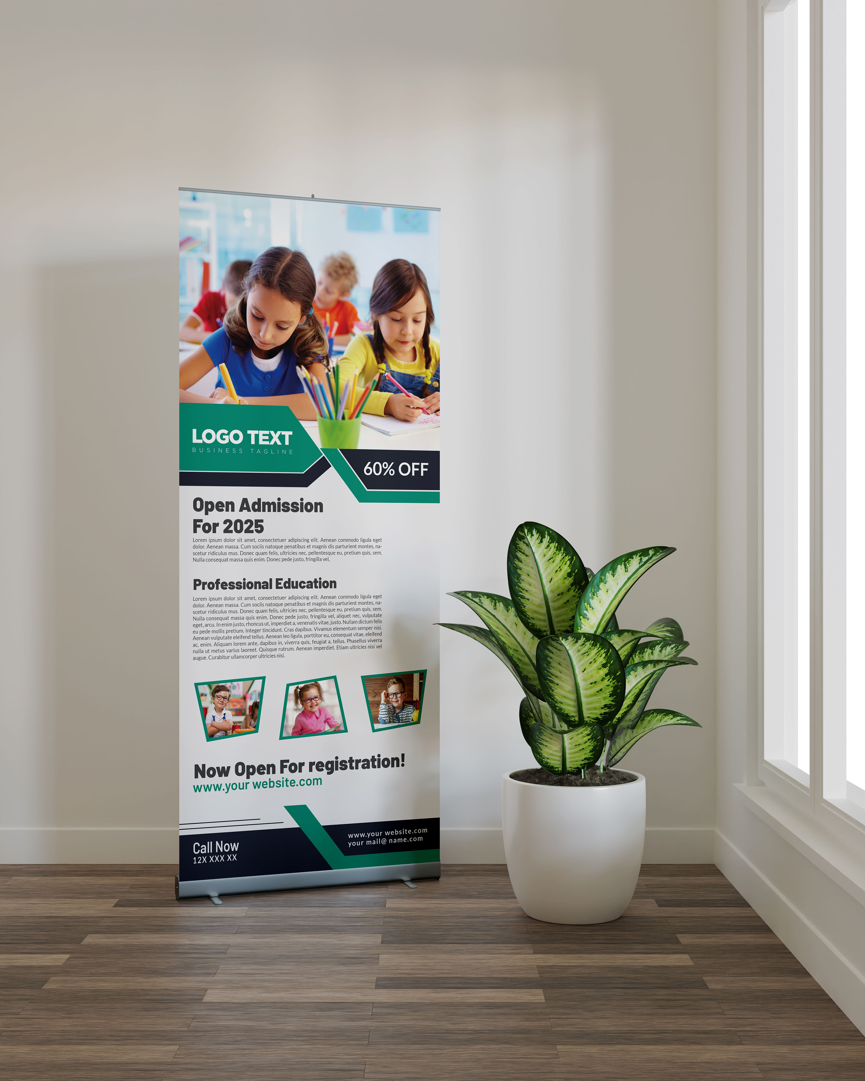 Back to school admission roll up banner template is a marketing tool that features a vertical banner layout and is designed to promote the opening of school admission. This design is typically used in schools to draw attention to the upcoming admission season and encourage parents and students to enroll.