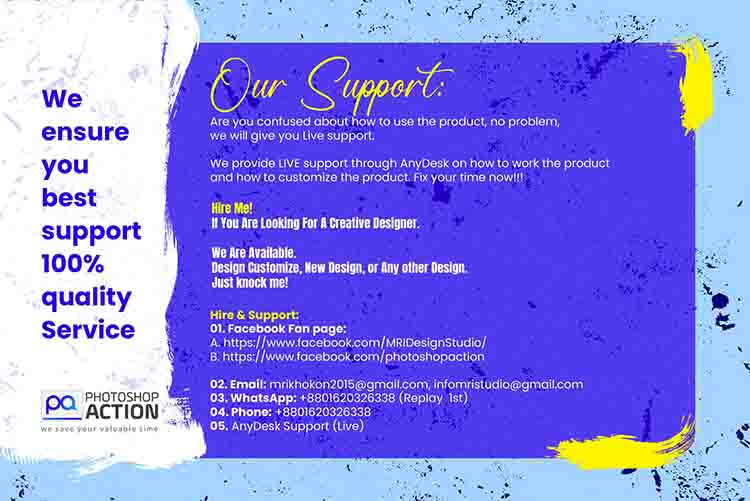 We provide LIVE support through AnyDesk on how to work the product and how to customize the product. Fix your time now!!! You can message the mentioned information Get support very quickly Hire Me! If You Are Looking For A Creative Designer. We Are Available. Design Customize, New Design, or Any other Design. Just knock me!